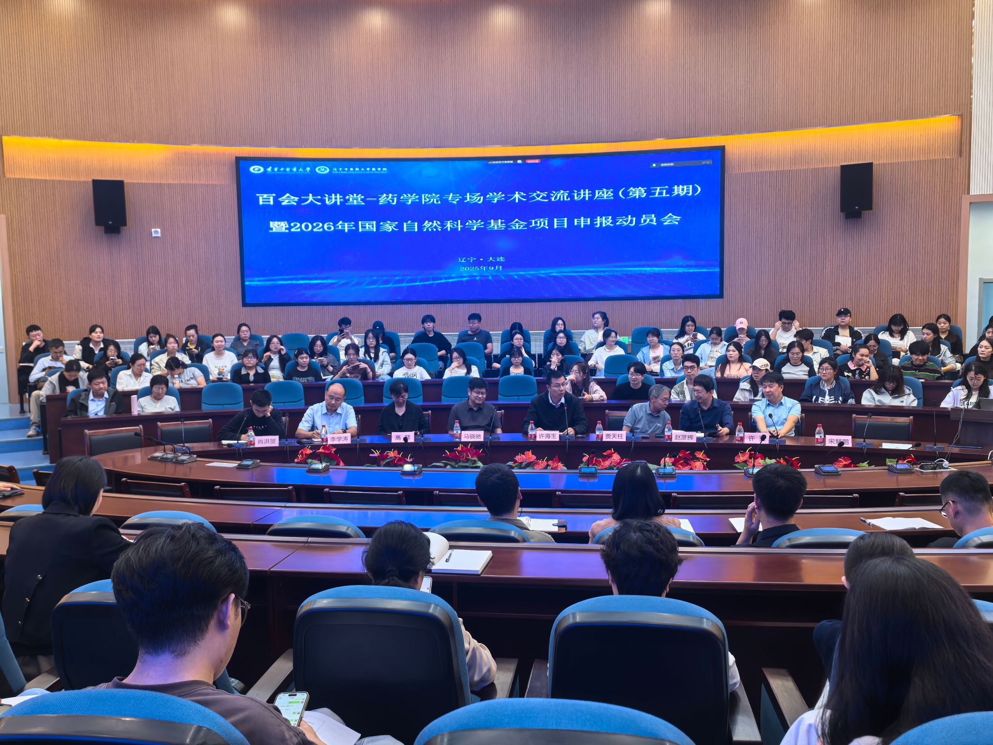 9月24日,药学院举办百会大讲堂——药学院专场学术交流讲座(第五期)暨2026年国家自然科学基金项目申报动员会。特邀国家杰出青年科学基金获得者、大连医科大学附属第二医院药学研究中心主任马骁驰教授,中华中医药学会中药炮制分会名誉主任委员、原药学院院长贾天柱教授作学术报告。学校副校长许海玉,综合运行维护中心副主任赵彦辉,药学院副院长高慧、许亮、李学涛、宋慧鹏、肖洪贺,全体教师及研究生参加了活动。本次活动由宋慧鹏主持。