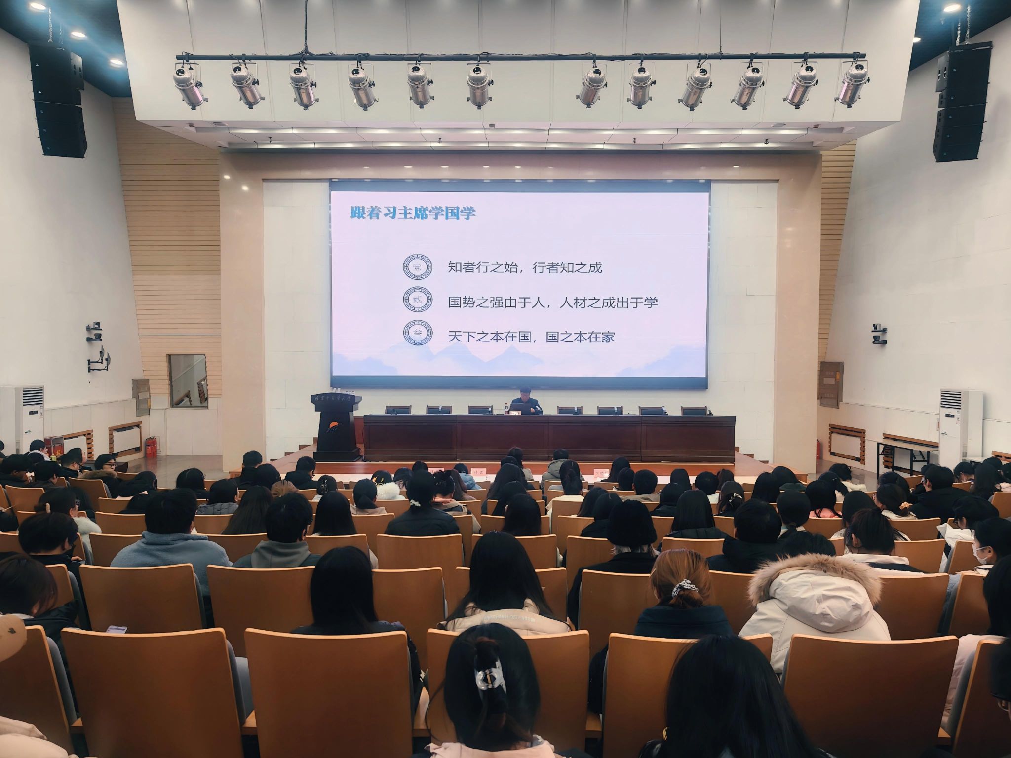 会上,凌常清围绕“知者行之始,行者知之成”“国势之强由于人,人材之成出于学”“天下之本在国,国之本在家”三句习近平总书记引用的经典古训展开系统讲解,深入阐释了知行合一的实践逻辑,深刻剖析了人才强国与勤学育才之间的时代关联,生动诠释了家国同构、命运与共的文化根基,为师生如何从中华优秀传统文化中汲取修身立德、立身处世的智慧与方法指明了方向。