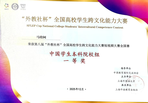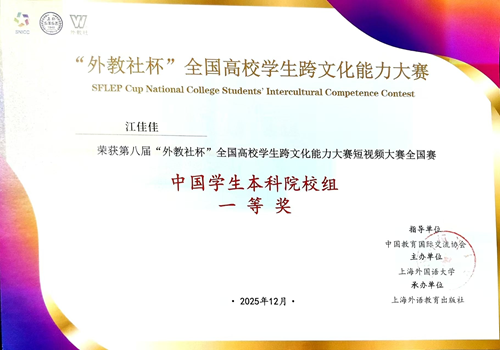 近日,由外教社主办的第八届“外教社杯”全国高校学生跨文化能力大赛短视频大赛圆满落幕。学校外国语学院学子凭借特色鲜明的作品与出色的跨文化表达能力,在全国百余所高校学子同台竞技中脱颖而出,斩获全国一等奖1项。