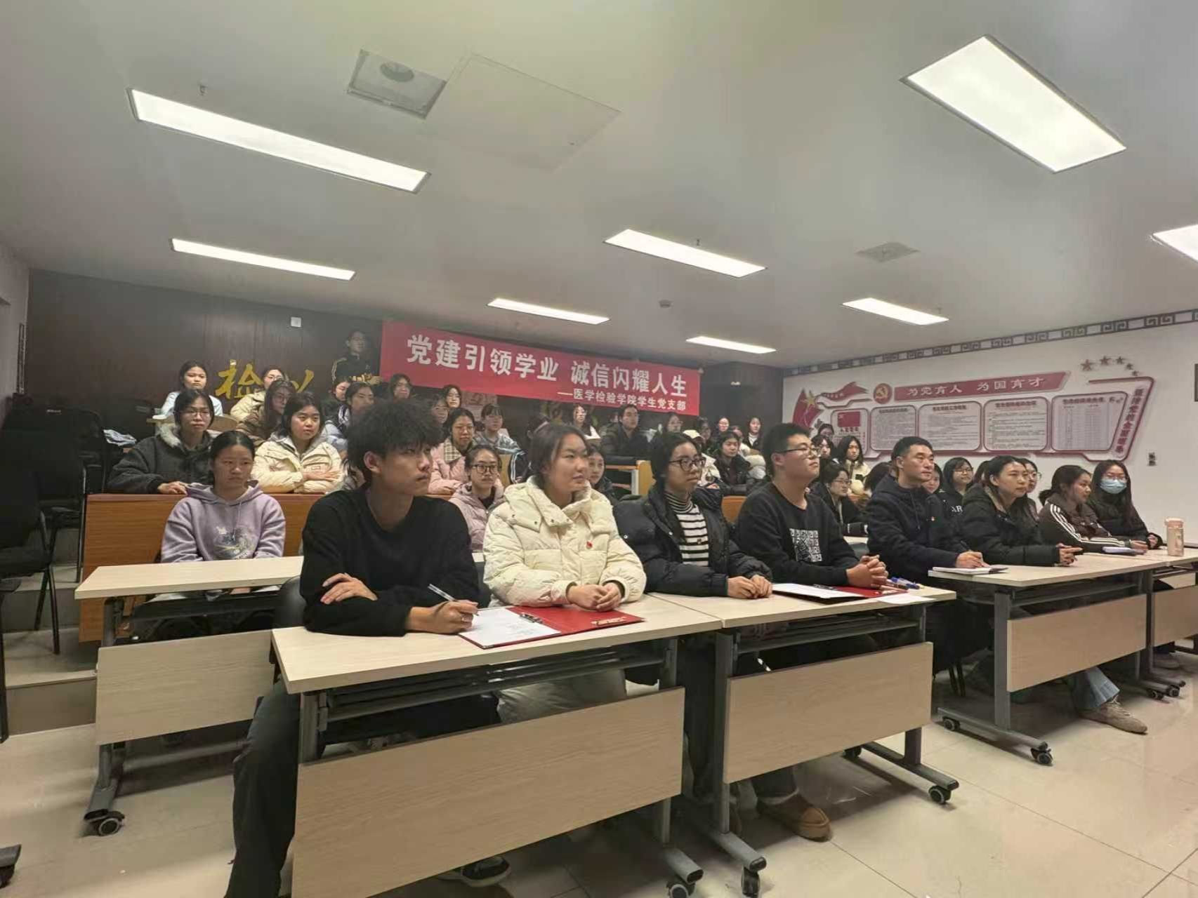 近日,医学检验学院学生党支部以主题党日为载体,开展“党建引领学业,诚信闪耀人生”系列活动,学院党总支副书记左帅,辅导员赵宇,全体学生党员、入党积极分子及学生代表共同参与。